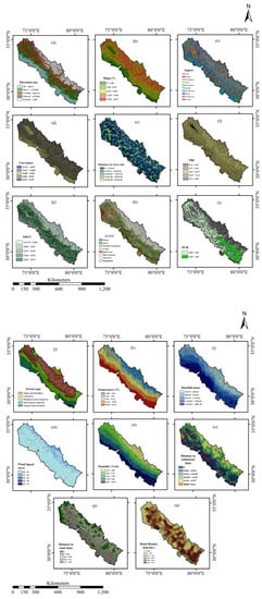 The data layers for the anthropogenic factors were prepared as follows. The distance-to-settlement map (Figure 5o) was prepared using built-up areas extracted from LULC using the Euclidean distance tool. The distance-to-road map (Figure 5p) was created from the Roads shapefile downloaded from the DIVA GIS Portal using Euclidean distance, and the road density map was prepared using the line density tool.