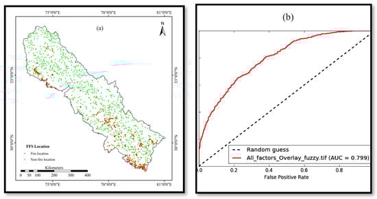 Validation is an essential procedure to determine the effectiveness of the chosen methodology in forest fire vulnerability assessment [6]. The receiver operating characteristic—area under the curve (ROC-AUC) technique is frequently used in accuracy assessment of various MCDM techniques, and because of its adaptability and efficacy in capturing the degree of vulnerability, this approach is preferred for assessing the accuracy of used models. In the current study, this approach was used for assessing the effectiveness of Fuzzy-AHP in FFS zonation. The ROC curve is a visual tool for evaluating the trade-off between specificity and sensitivity (calculated according to Equations (9) and (10)), with the x-axis showing a false-positive rate (specificity) and the y-axis showing a true-positive rate (sensitivity) to judge the accuracy of the model’s predicting ability [85].