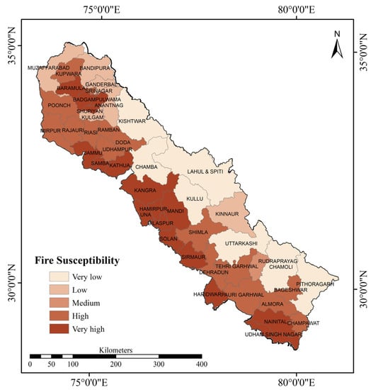 Globally, Asia ranks as the fourth most affected continent, facing significant threats from forest fires [10]. Within the South Asian region, India emerges as the second most at-risk nation, with a 32% vulnerability rate, ref. [11]. Over the past two decades, India has witnessed a staggering tenfold increase (52%) in intense forest fire incidents [12]. These fires primarily impact the deciduous forests in central and southern India, as well as the forests within the western and eastern Himalayas [13,14,15]. Forest fires in India are widespread, encompassing a vast geographical area and arising from both natural and human factors. Each year, an estimated 3.73 million hectares of forest land experience burning, resulting in an approximate economic loss of about USD 110 million [16]. Forest fires in the Indian Western Himalayas (IWH) region are a persistent hazard that is further intensified by the changing climatic trends [17]. The IWH region is renowned for its rich biodiversity, pristine landscapes, and significant contribution to the provision of vital ecosystem services. The geographical area under consideration is characterized by diverse forest types, steep terrain, and a wide range of climatic conditions, making it particularly vulnerable to forest fires. The susceptibility of these forests to fire has been further exacerbated by climate-change-induced variations in temperature and precipitation patterns. States such as Uttarakhand, Himachal Pradesh, and Jammu and Kashmir are particularly vulnerable to forest fires due to the combined effects of climatic conditions, geographical features, vegetation types, and human activities [18]. The Indian Western Himalayas has witnessed significant forest fire incidents in recent decades, mainly concentrated during the hot and arid pre-monsoon season spanning from March to June [19,20]. Between 2001 and 2019, the burn area increased in Uttarakhand and Himachal Pradesh at a rate of 72.94 km2 per year [21]. These fires not only pose a direct threat to forest ecosystems and wildlife but also have adverse impacts on air quality, water resources, and the livelihoods of local communities. Hence, as part of broader initiatives to tackle this challenge, effective fire management strategies, community engagement, the identification of forest fire vulnerability, and sustainable land management practices are crucial [22].