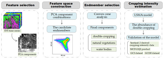 The major steps of the methodology, including feature selection, feature space construction, endmember selection, cropping intensity estimation and validation, are presented in the flowchart (Figure 3).