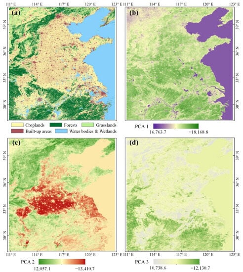 Principal component analysis (PCA) has been proven to be effective at detecting seasonal changes in vegetation when applied to the time series vegetation index [44]. PCA transformation projects original data into new k-dimensional components ordered by variance, with the majority of information provided by the first several components. PCA components have geographic meanings; for example, Henderson et al. [45] found the components corresponding closely to typical vegetation density or degree of seasonality, Wang et al. [46] found the components coinciding with the average normalized difference vegetation index (NDVI) (PCA component 1) and accounting for the most prominent man-induced vegetation alterations (PCA component 2).