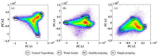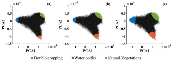 Through visually examining the scatter points based on the N-dimensional visualization tool in ENVI, we found that the PCA 1 and PCA 3 combination and PCA 2 and PCA 3 combination should be excluded, and the PCA 1 and PCA 2 combination would be the best choice (Figure 6). The mixture of single-cropping and natural vegetation could explain the exclusion of the PCA 1 and PCA 3 combination. As for the exclusion of the PCA 2 and PCA 3 combination, the single-cropping could not be used as an endmember because its cropping intensity was about half that of double-cropping theoretically and could only be inside the boundary of the feature space. With the PCA 1 and PCA 2 combination, all pixels clustered closest to a triangle in the feature space, with three vertexes representing double-cropping, natural vegetation and water bodies, which could be the candidate endmembers (Figure 7).