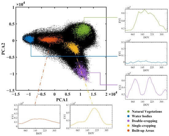 PCA transformation was applied to the original time series MODIS EVI to obtain components with geographic meanings while reducing feature dimensions. In this study, the first three components reserved 93.18% of the original information. From PCA component 1 (PCA 1), vegetation and non-vegetation (water bodies and built-up areas) could be easily distinguished, and the difference between natural vegetation and croplands was also very significant (Figure 5a,b). PCA component 2 (PCA 2) could discriminate double-cropping from other land-cover types, and the difference between double-cropping and single-cropping was also very obvious (Figure 5c). Moreover, PCA component 3 (PCA 3) could discriminate single-cropping from other land-cover types (Figure 5d). Therefore, the combination of the first few components could be used to discriminate the major land-cover types.