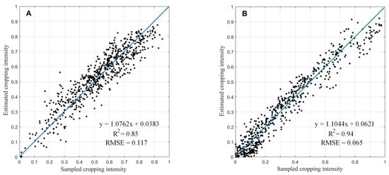 Linear fitting of the Sentinel-2 derived cropping intensity and estimated cropping intensity. (A,B) are two test regions.