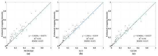 Linear fitting of the estimated cropping intensity and three cropping frequency datasets at the county level: (a) MCD12Q2, (b) GCI and (c) GCI30.