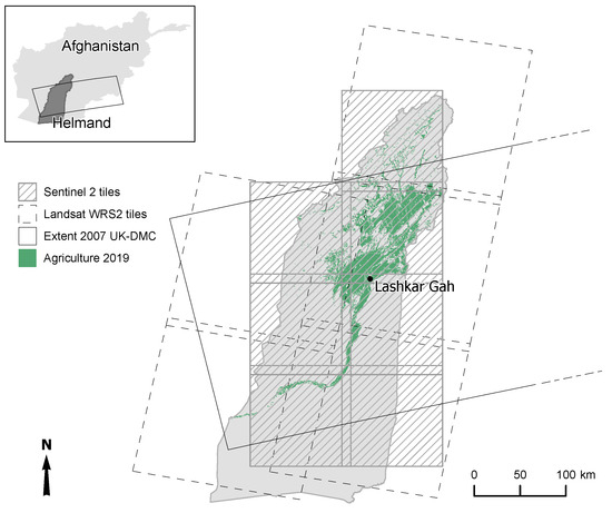 Image collection extents for Landsat World Reference System-2 (WRS2), Sentinel-2, and 2007 UK Disaster Monitoring Constellation (UK-DMC) for Helmand Province, Afghanistan, with agricultural area from 2019 (CNN model output) shown for context.