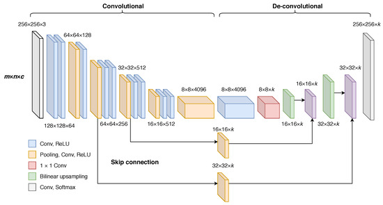 The FCN-8 model architecture using 256 × 256 three band image chips. are the vertical and horizontal dimensions, c is the number of input features, and k is the number of output classes (Adapted from [19]).