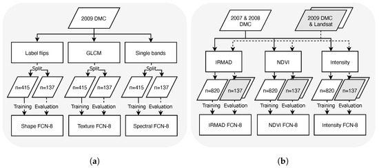Sets of standardised image samples were created from the 2007 and 2008 DMC images for training individual FCN-8 models for each approach (Figure 7) and validated on DMC and Landsat-5 images from 2009 (steps shown in Figure 3b). For the IR-MAD normalised set, images were resampled to the same 32 m pixel grid and normalised to a target DMC image from 27 April 2007 using code from [27] (available at https://github.com/mortcanty/CRCPython (accessed on 2 August 2023)). Image chips were then extracted at the sample locations for model training (n = 820). Validation samples (n = 137) were extracted from 2009 DMC and Landsat-5 images, and were normalised using the same target DMC image. No Landsat-5 data were used in training this model.