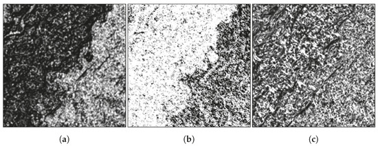 Examples of (a) homogeneity, (b) entropy, and (c) correlation textural inputs for the same sample shown in Figure 4. Sample size 256 × 256 pixels.