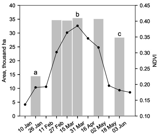 Effect of image timing on (bars) the total classified area of agriculture and (line) mean NDVI from cloud-free samples in Helmand Province 2015. NDVI averaged within the agricultural area classified from the optimally timed image, collected on 31 March 2015. Labels a, b, and c are the image dates shown in Figure 11.