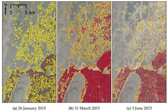 Classification of standardised Landsat-8 images from 2015 using the generalised model show variation in the agricultural area according to crop development measured using NDVI (Figure 10). Early in the season, before green-up of the annual crops, the model underestimates the agricultural area as the vegetation response is weak because individual plants are small (Figure 11a). The classified area increases rapidly once plant canopies begin to develop and is close to the maximum (Figure 11b) at 50% of the peak NDVI at 27 February (Figure 10). The classified area reduces after first cycle crops have senesced (Figure 11c), indicated by a sharp fall in NDVI (Figure 10). These results show a timing window for image collection of three weeks either side of the peak in vegetation activity, with images close to the peak giving the largest overall agricultural extent.