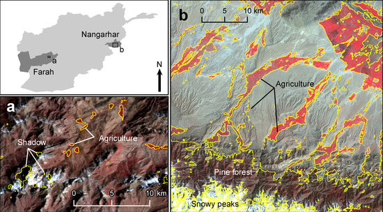 Examples of classification errors (false positives) in agricultural masks for (a) Farah and (b) Nangarhar Provinces in 2008 created using the generalised FCN-8 model (in yellow). Commission errors around snow covered peaks with shadow can been seen in the south west of both examples and a large area of pine needle forest is classified as agriculture in the lower third of b. Image backgrounds are near-infrared false colour composites of DMC collected (a) 5 April 2008 and (b) 22 March 2008, inset locations shown in the overview map, top left.