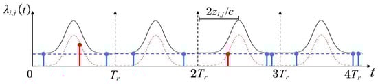In this work, we assume that the emitted laser pulse shape is Gaussian (, where is the root mean square pulse width). As described in [], when the pixel is detected by a laser pulse, the output response of the Gm-APD detector is a non-homogeneous Poisson process with both noise and signal echo. The total intensity is
