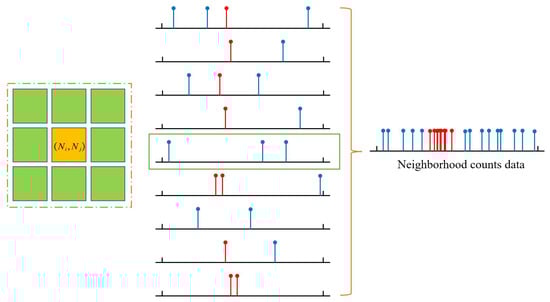 In photon counting imaging detection, as shown in Figure 1, the echo photon counting model can be obtained after the accumulation of four pulse detection cycles at pixel . It can be seen that the echo photon data of each pixel include two parts: signal counts and noise counts, which are represented by red and blue lines, respectively. Signal detection has the characteristics of slight variance. Therefore, the signal photon clusters can be considered to be concentrated near the depth of the target to be measured. However, compared with the signal data, it is generally believed that the noise data are constant or slightly changed in a specific time range, showing the characteristics of uniform distribution.
