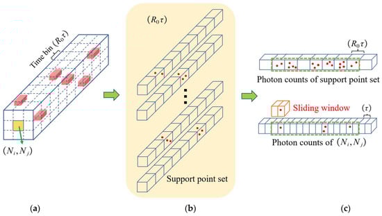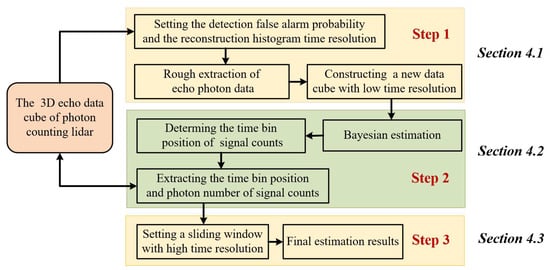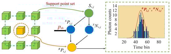 When the support point set is given, the signal photon counts and the time bin position of each pixel can be obtained by using the preset time bin position detection threshold . The overall architecture of the Bayesian estimation is shown in Figure 6.