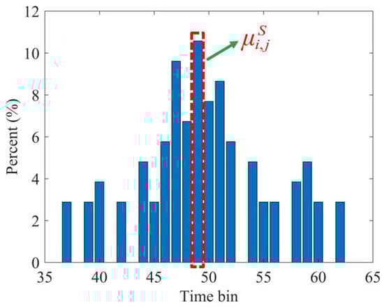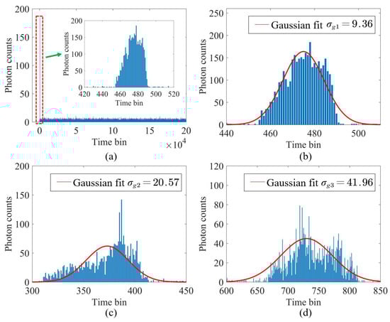 We accumulate the time bin position () of the echo photon data in the support point set () into the same coordinate system and define the time bin position with the most occurrences as the Gaussian distribution mean, as shown in Figure 7.