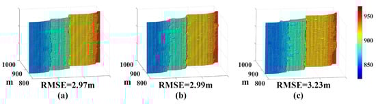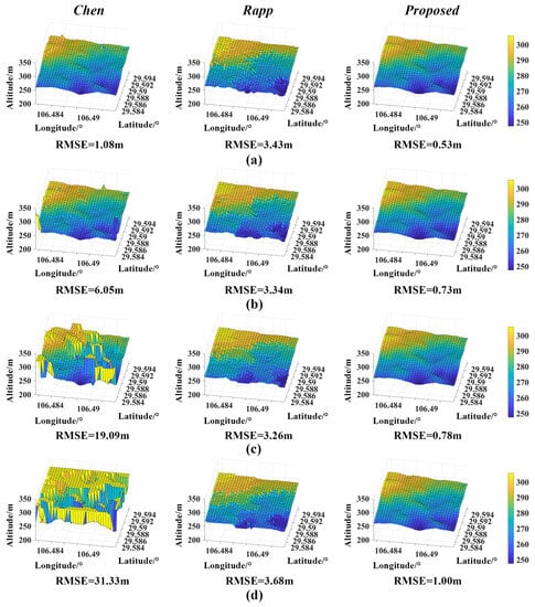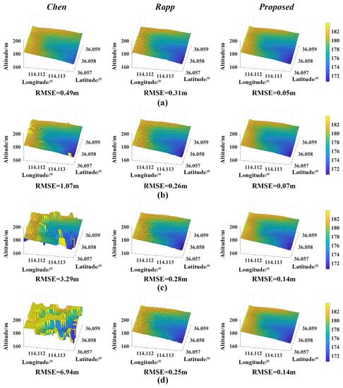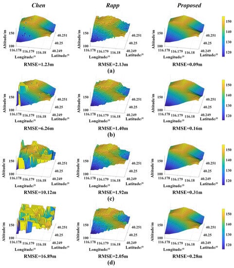 Under the four noise count rates, the minimum RMSE values of terrain reconstruction using the Chen algorithm, the Rapp algorithm and the proposed method are 1.08 m, 3.43 m and 0.53 m, respectively. The RMSE obtained by the proposed method is at least 50.9% lower than that obtained by the other two methods. The SRE results presented in Table 4 show that the minimum SRE values of terrain reconstruction using the Chen algorithm, the Rapp algorithm and the proposed method are 19.60 dB, 37.54 dB and 48.84 dB, respectively. The proposed method has the best SRE at the same noise count rate. The reconstruction results of undulating terrain 3 further prove the robustness of the proposed method to the echo photon data generated by the target with depth fluctuation.