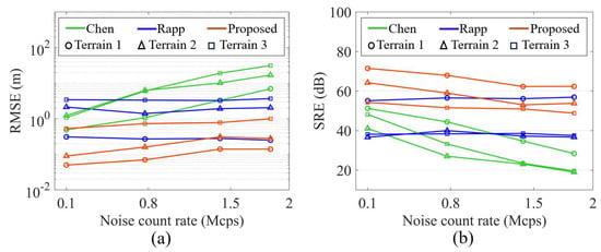 Under different noise count rates, the RMSE and SRE change curves obtained using various methods to reconstruct the three undulating terrains are shown in Figure 15. Figure 15a shows the changing trend of RMSE, and Figure 15b shows the change in SRE. Compared with the Chen algorithm, our method can not only retain as many signal counts as possible but also reduce the interference of noise counts by setting the time resolution of histogram reconstruction in the range of . Therefore, the estimation results of the depth information of the terrain obtained by the proposed method are more consistent with the actual depth information. Compared with the Rapp algorithm, our method uses reconstructed histograms and adaptive signal segmentation technology for rough data extraction. Then, by introducing a support point set, data screening and discrimination are carried out in the Bayesian framework, which not only helps to reduce the amount of calculation but also dramatically improves the accuracy of data discrimination.