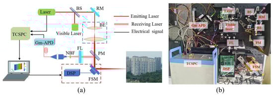 Experimental setup of our photon counting LiDAR system. (a) Block diagram. (b) Physical image of the experimental device. BS, beam splitter; RM, reflecting mirror; BE, beam expander; PM, 45° perforated reflector; FL, optical focusing lens; NBF, narrow band-pass filter; FSM, fast steering mirror; DSP, digital signal processing; Gm-APD, Geiger mode avalanche photodiode.