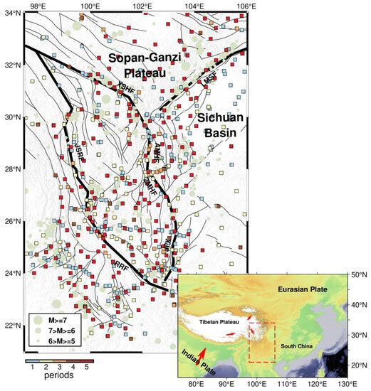 Distribution of GPS stations in the Sichuan–Yunnan region. Colored squares indicate the station location with different periods (1-, 2-, 3-, 4-, and 5- periods are displayed using different colors); pale green circles represent historical earthquakes from 1976 to 2016, provided by the U.S. Geological Survey website (https://earthquake.usgs.gov/earthquakes/search/, (accessed on 1 July 2023)); the black solid lines represent active faults; the thick black solid lines highlight the boundary faults, including the Longmenshan Fault (LMSF), Xianshuihe Fault (XSHF), Anninghe Fault (ANHF), Zemuhe Fault (ZMHF), Xiaojiang Fault (XJF), Jinsha River Fault (JSRF), and Red River Fault (RRF). In the inset, the red dashed lines show the limits of the study area and the red arrows indicate motion directions of the Indian Plate and Tibetan Plateau.