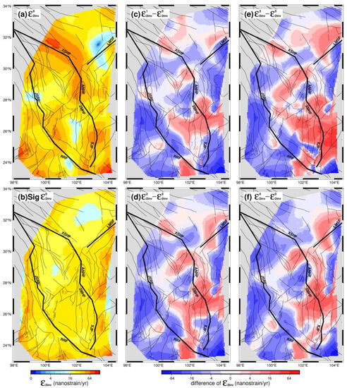 The second strain rate invariant in the Sichuan–Yunnan region calculated from the velocity field V0 (a) and its 1-sigma uncertainty (b). The difference distributions between the second strain rate invariants calculated from the velocity fields V1, V2, V3, and V4 and V0, shown in (c–f), respectively.