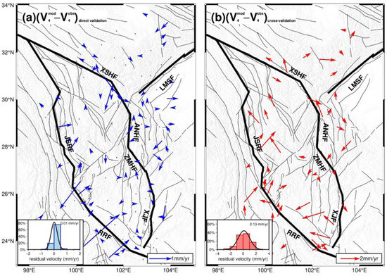 Firstly, the direct validation method was used to fit the velocity at all stations under the constraint of each velocity field, resulting in the RMSE values for various versions of the velocity fields. Taking the example of the fitting results in the V4 field, the average residual velocity was 0.01 mm/yr, the MAE was 0.10 mm/yr (Figure 5a), and the error limit of velocity residuals (taking three times the RMSE) was 0.72 mm/yr. For other velocity fields, all MAEs were less than 0.3 mm/yr and the error limits were 1.21, 0.55, 0.61, and 1.05 mm/yr, respectively. Secondly, the cross-validation method involved randomly selecting 30% of the stations as the validation group, then using the remaining 70% of stations to interpolate the velocities at the stations in the validation group and calculating the external fitting accuracy of the model by comparing the interpolated and measured velocities for the validation group stations. For the cross-validation in the V4 field, the average residual velocity was 0.13 mm/yr (Figure 5b), the MAE was 0.74 mm/yr, and the error limit was 2.70 mm/yr. The MAEs were 1.79, 0.92, 0.75, and 1.20 mm/yr and the error limits were 6.48, 3.19, 2.93, and 4.14 mm/yr for other velocity fields, respectively. Finally, compared with the mean velocity uncertainties in each velocity field, both direct validation and cross-validation MAEs are smaller, indicating that the fitted velocity fields and strain rate fields are reliable by using the improved least squares collocation method in this study.