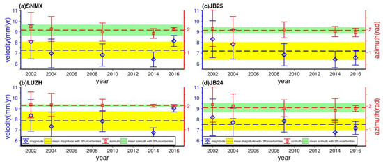 If there is a systematic bias between velocity fields, it will cause a large deviation in the calculated strain rate, so the existence of systematic biases needs to be verified. This study selected four common stations for the assessment. These stations were located in the South China Block and away from the strong earthquake epicenters, thus their velocities are relatively stable over time. If significant variations are observed in the velocities of these stations, it would indicate substantial systematic bias between the velocity fields. The information of selected stations is described in Table 3. Among these stations, JB25 exhibits the largest change in velocity value, with a value of 1.9 mm/yr; SNMX has the largest change in the velocity direction, with a value of 16.9°. Compared with their uncertainties in velocity magnitude and azimuth, the velocity changes at the four stations were less than twice their uncertainties (Figure 6). This implies that there was no large change in velocity, suggesting the absence of systematic biases between various velocity fields.