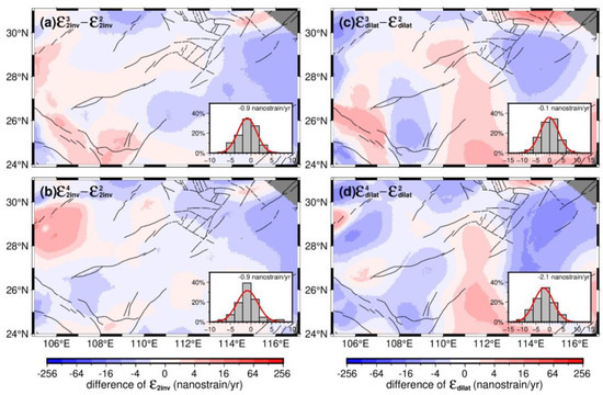 Regarding the effects of other non-tectonic deformations, such as atmospheric loading, tidal ocean loading, and continental water loading, we treated them as an overall deviation and conducted a quantitative evaluation in the South China Block interior. Previous studies have demonstrated that crustal deformation changes within the South China Block are extremely weak [1,2], so we assume changes in the strain rate field within the block are collectively caused by other non-tectonic deformations. Due to the sparse distribution of GPS stations within the South China Block in the V0 and V1 fields, we selected the common stations from three other velocity fields for the strain rate field computation and comparative analysis. Prior to computation, the velocity fields of the common stations were interpolated and densified to match the station spacing of common stations in the Sichuan–Yunnan region. The strain rate differences between the strain rate fields calculated from V3, V4, and V2 (Figure 8) indicated that other non-tectonic deformations can impact the calculation results. The maximum average differences in the second strain rate invariant and dilation rate were −0.9 and −2.14 nanostrain/yr, respectively. Nevertheless, the calculation results in the Sichuan–Yunnan region show that the second strain rate invariant differences were between −0.8 and −4.8 nanostrain/yr and the dilation rate differences were between −7.0 and 0.8 nanostrain/yr. Similar to the station spacing, the changes in the strain rate fields caused by other non-tectonic deformations were comparable to the calculation results. Thus, it is challenging to directly deduct them from the calculation results in order to improve the accuracy of the results. However, for the sake of enhancing the reliability of spatiotemporal characteristics of the strain rate fields, this study assumes that when the strain rate changes are greater than three times the mean strain rate variation caused by non-tectonic factors, the strain rate changes can be considered significant.