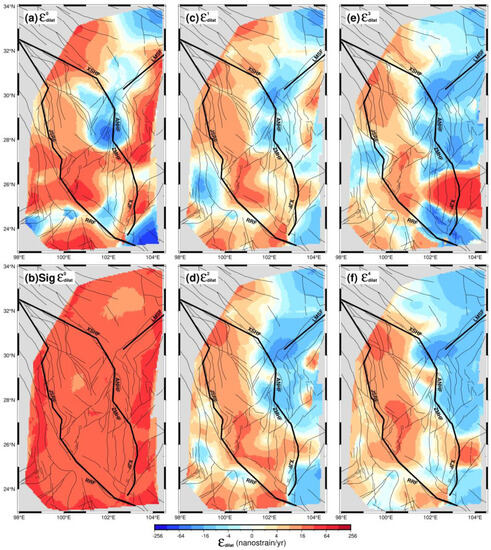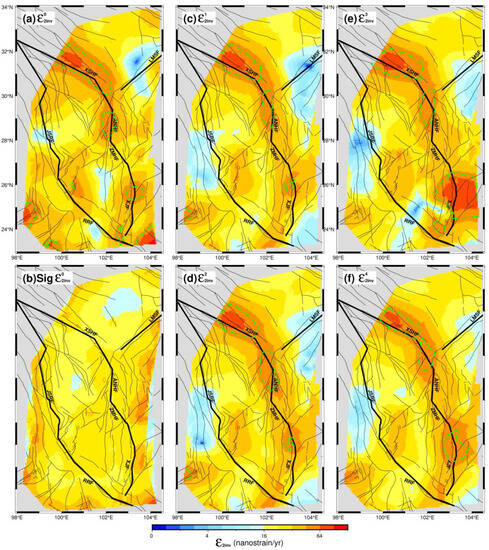 Dilation rate in the Sichuan–Yunnan region calculated from the velocity field V0 (a) and its 1-sigma uncertainty (b). The difference distributions between the dilation rates calculated from the velocity fields V1, V2, V3, and V4 and V0 shown in (c–f), respectively.