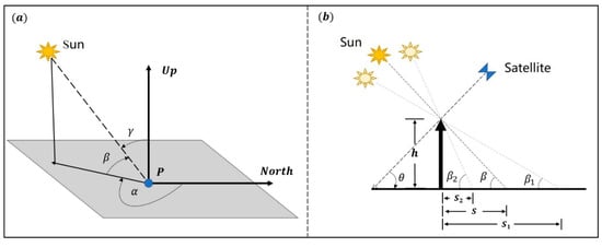 Diagram of solar and satellite imaging geometries. (a) The geometric relationship between the solar zenith angle; is the solar altitude angle, is the solar zenith angle, and is the solar azimuth angle. (b) Schematic diagram of imaging the sun, satellite, and object; is the altitude of the object, is the satellite altitude angle, is the actual object imaging shadow length.