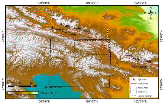 This study focuses on the case of the Mw 6.9 Menyuan Earthquake in Qinghai (37.77°N, 101.26°E), China, which occurred on 8 January 2022 (Figure 2). The focal depth of the earthquake was estimated to be approximately 13 km by the United States Geological Survey (USGS) []. The seismogenic fault zone for this earthquake is the Lenlongling Fault Zone, one of the segments of the Qilian-Haiyuan Fault Zone, located at the northeastern margin of the Qinghai-Tibet Plateau []. The focal mechanism solution indicates that the earthquake occurred on a left-lateral strike-slip fault []. Field investigations have revealed significant surface ruptures in the vicinity of the epicenter, indicating strong horizontal ground displacement caused by the earthquake. Previous studies have indicated that the post-seismic deformation in this case can be considered negligible compared to co-seismic deformation [], so we did not consider the influence of post-seismic deformation in this study.