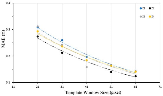 Variations of MAEs along with the sizes of correlation template window and for image pair No.1 (5 January 2022–10 January 2022).