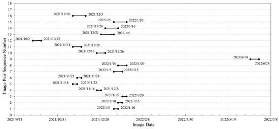 The ImGRAFT software implements optical POT using the orientation correlation algorithm. The matching template window size for the reference image was set to 41 × 41, and the corresponding search window size for the secondary image was set to 81 × 81. The obtained POT results were masked based on the correlation signal-to-noise ratio using a threshold of 0.4. We also removed 5 image pairs with low matching correlation (MAEs > 0.50). Finally, we obtained 16 POT image pairs including 6 pairs with a 5-day interval, 6 pairs with a 10-day interval, and 4 pairs with a 15-day interval (see Figure 4). The vertical axis represents the sequence number of the image pairs and the horizontal axis represents the image dates in Figure 4. The results obtained from the POT calculation represent the north-south and east-west displacements of the Earth’s surface, and their fusion allows for the calculation of horizontal displacement.