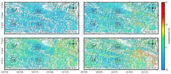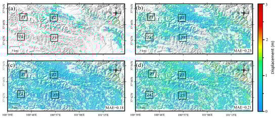 where represents the number of pixels in the selected window, is the arithmetic mean value of the pixels in the deformation map, and represents the individual pixel value. Furthermore, considering that different regions in the far field have different observational conditions, we randomly selected four regions: Z1~Z4 with each having a size 213 × 155 pixels (~24 km2) to calculate the MAEs. The average of these four regions’ MAE was then used to assess the POT accuracy for the whole area.