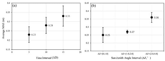 Changes in far-field MAE for different groups of POT measurements. (a) Effect of image-pair time interval on MAE. (b) Effect of difference in solar zenith angle on MAE.