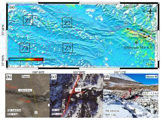 - Yuan, D.Y.; Xie, H.; Su, R.H.; Li, Z.M.; Wen, Y.M.; Si, G.J.; Xue, S.Y.; Cheng, G.; Liu, B.X.; Liang, S.M.; et al. Characteristics of co-seismic surface rupture zone of Menyuan Ms6.9 earthquake in Qinghai Province on January 8, 2022 and seismogenic mechanism. Chin. J. Geophys. 2023, 66, 229–244. [Google Scholar]