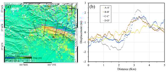 (a) East-west ground deformation derived from POT with the near-infrared band of the optimized image pair 5 January 2022–10 January 2022 (No. 1 in Table 2). (b) The displacement along the four profiles AA’, BB’, CC’, and DD’ in (a).