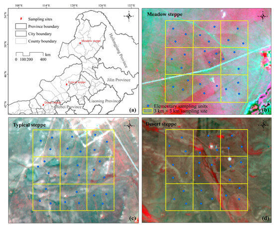 Distribution of sampling plots by grassland types: (a): site locations; field sampling sites (b): meadow steppe, (c): typical steppe, (d): desert steppe. The background map shows the Landsat-8 operational land imager (OLI) false-color composite image.