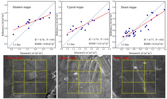 A total of 129 in situ LAI sample plots were used to indirect validation, 52 in meadow steppe, 44 in typical steppe, and 33 in desert steppe (Table 3). First, the NDPI of the study area were calculated using remote sensing images, and the statistical model was established by randomly selecting 75% of the ground-measured LAI values and the corresponding point vegetation index values, then the LAI values were obtained by vegetation index inversion according to the statistical relationship, and the remaining 25% of the ground-measured LAI was used for comparison with the Landsat8 OLI-based inversion LAI values. The comparison results are shown in Figure 4, where RMSE = 0.40 for meadow steppe, RMSE = 0.21 for typical steppe, and RMSE = 0.18 for desert steppe, indicating that the models for the three grassland types can estimate the true values better. We used medium to generate LAI reference maps with a spatial resolution of 30 m, and then resampled the 30 m resolution LAI to 500 m spatial resolution. A comparison was made between the scale-transformed ground data and the product LAI values to check the difference between the product and the ground-truth data, giving the basis for selecting the LAI product to analyze the vegetation change.