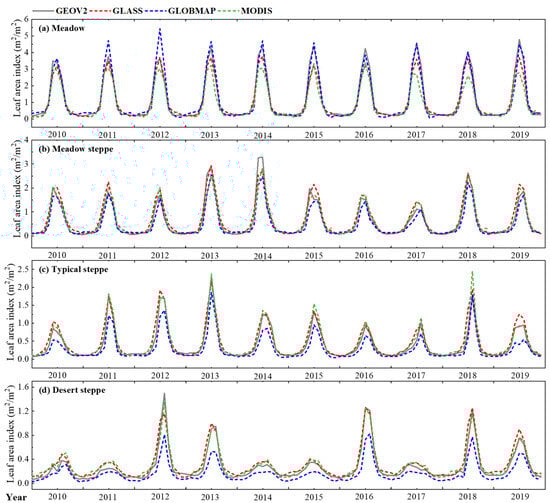 Temporal changes of the leaf area index (LAI) products from 2010 to 2019. A large sample plot of 5 × 5 km was selected to represent the LAI value of a period after taking the mean value for each of the four grassland types. These include meadow (50.79°N, 122.17°E) and meadow steppe (49.36°N, 120.11°E) at Hulunber, typical steppe (43.54°N, 116.65°E) at Xilinhot, and desert steppe (41.77°N, 111.87°E) at Erlianhot, which can be found in Figure 1.