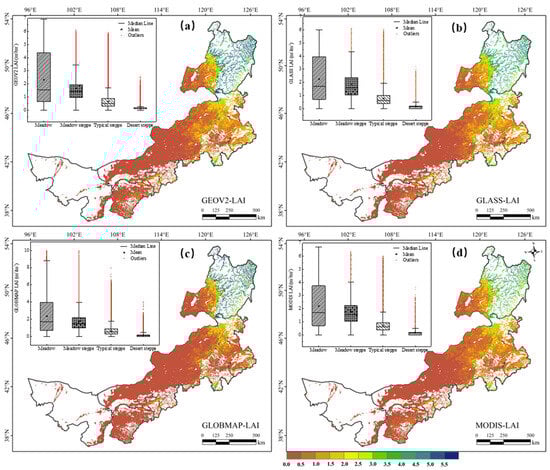 Spatial distribution and boxplots of annual mean leaf area index (LAI) from four LAI products in July of 2010–2019: (a) GEOV2; (b) GLASS; (c) GLOBMAP and (d) MODIS. The red points in boxplots represent the outliers.