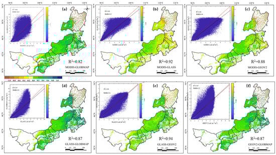 In the spatial difference between pairs of LAI products, LAI values were more disparate in the northeast, corresponding to meadow, which had the widest range of values and the greatest uncertainty, and GEOV2 LAI generally had the highest LAI. GLASS LAI and GEOV2 LAI had the most similar spatial distribution characteristics (Figure 7). Among the six pairs of LAI products, two pairs have high correlation with R2 > 0.90: GEOV2 LAI vs GLASS LAI (R2 = 0.94) and GLASS LAI vs MODIS LAI (R2 = 0.92). MODIS LAI and GLOBMAP LAI had the lowest correlation values (R2 = 0.82), and the remaining three pairs had moderate correlation values. Compared with GLASS LAI, the correlation can be ordered by GEOV2 LAI (R2 = 0.94), MODIS LAI (R2 = 0.92), and GLOBMAP LAI (R2 = 0.87).