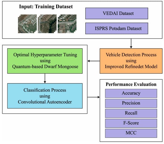 The deep learning (DL) methods and the traditional ML approaches are the two classes of target detection techniques using aerial images. The low-level image features, including color, corner, edge, shape, and texture, are extracted for classification and training in the ML approaches [5]. Researchers have introduced a target detection architecture, which uses a local binary pattern (LBP) in combination with histogram of gradients (HOG), for the detection of vehicle targets. The color difference is used for the recognition of blob-like areas extracted from grayscale and color features [6]. Moreover, there are CV technologies that use the optical flow and frame difference for the detection of moving vehicles. Vehicle detection aims to identify each instance of the vehicle in RSI. In former approaches, researchers have developed and extracted features and later categorized them to accomplish target detection [7]. The basic concept is to extract vehicle features and utilize ML methods for classification. RSI has been extensively utilized in several domains, namely urban and rural planning, disaster monitoring, national defense construction, agricultural management, and so on [8]. There also exists a huge gap between the detection performance and accuracy compared to the tremendous growth of DL techniques. Network models based on DL approaches have been prominently employed for large computer vision domains and have shown effective results [9]. Two categories of detection networks have been formed and continuously enhanced, single-phase networks and two-phase networks, with the progression of hardware technology and big data [10]. This study develops the Improved Deep Learning-Based Vehicle Detection for Urban Applications using Remote Sensing Imagery (IDLVD-UARSI) technique. The major aim of the IDLVD-UARSI method emphasizes the recognition and classification of vehicles in RSI. To achieve this, the IDLVD-UARSI method utilizes an improved RefineDet model for the vehicle detection and classification process. Once the vehicles are detected, the classification process takes place using the convolutional autoencoder (CAE) model. Finally, a Quantum-Based Dwarf Mongoose Optimization (QDMO) algorithm is applied to ensure an optimal hyperparameter tuning process and it helps in achieving improved performance. The simulation results of the IDLVD-UARSI technique are obtained on benchmark databases. The major contributions of the paper are given as follows.