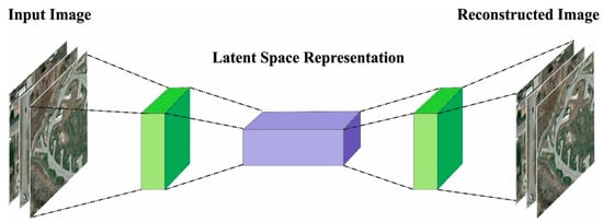 In this work, the CAE model is utilized for the identification and classification of vehicles. As a variant of AE, CAE integrates the capability of autoencoder (AE) to represent the input dataset and the capability of CNNs to effectively extract image features [23]. An encoder and decoder are two NN blocks used to recreate the input. The encoded block is used to encode the input into hidden outcome , which is a compressed form of input. The dimension of the hidden outcome is smaller than that of the input . The decoder relies on the hidden output and generates the output, , to the input, . AE is trained to minimize the reconstructed loss of the network for the proper regeneration of the original input. Figure 2 displays the infrastructure of CAE.