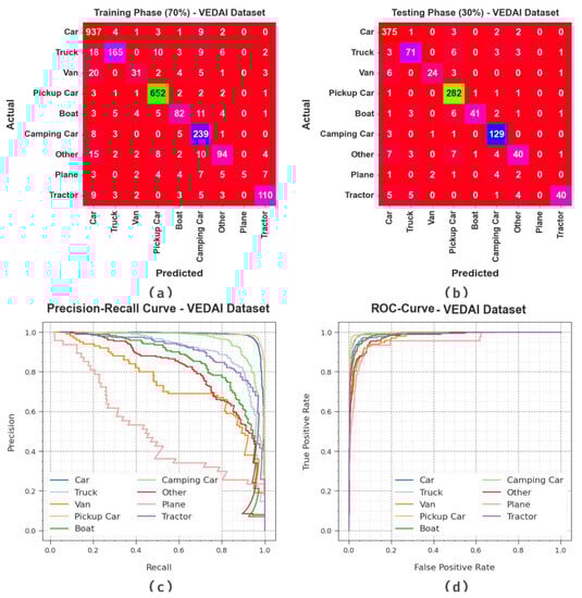 Performances on VEDAI database. (a,b) Confusion matrices, (c) PR curve, and (d) ROC.