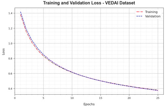 In Figure 6, the and outcomes of the IDLVD-UARSI method on the VEDAI database are shown. The defines the error among the predictive performance and original values on the TR data. The represents a measure of the performance of the IDLVD-UARSI technique on individual validation data. The results show that the and tend to decrease with rising epochs. This indicates the enhanced performance of the IDLVD-UARSI technique and its capability to generate accurate classification. The reduced values of and reveal the enhanced performance of the IDLVD-UARSI technique in capturing patterns and relationships.