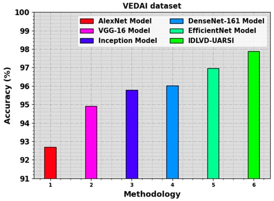 The comparison results of the IDLVD-UARSI technique on the VEDAI database are reported in Table 4 and Figure 7 [28,29]. The experimental outcomes show that the AlexNet and VGG16 techniques have poor performance. In addition, the Inception, DenseNet-161, and EfficientNet models show moderately improved results. Nevertheless, the IDLVD-UARSI technique exhibits improved results, with maximum of 97.89%.