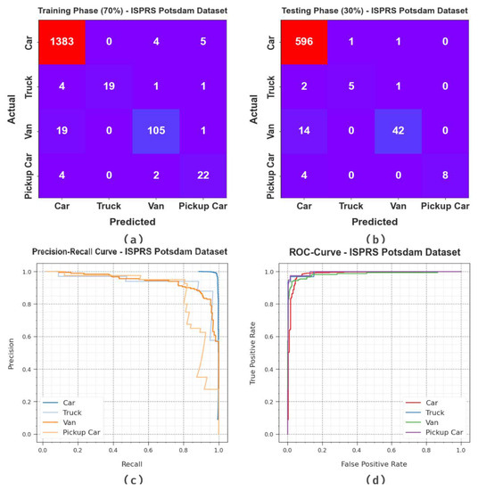 Performances on ISPRS Potsdam database. (a,b) Confusion matrices, (c) PR curve, and (d) ROC.