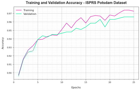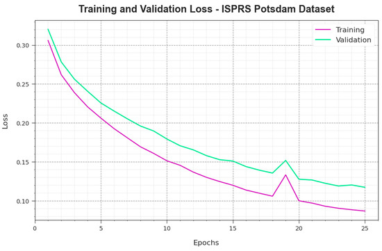 Figure 9 presents the training accuracy and of the IDLVD-UARSI technique on the ISPRS Potsdam database. The is determined by the evaluation of the IDLVD-UARSI technique on the TR database, whereas the is computed by evaluating the performance on a separate testing database. The results show that and increase with an increase in epochs. Accordingly, the performance of the IDLVD-UARSI technique is improved on the TR and TS databases with a rise in the number of epochs.