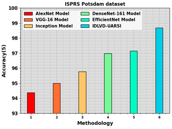 The comparison results of the IDLVD-UARSI technique on the ISPRS Potsdam database are reported in Table 6 and Figure 11. The experimental outcomes show that the AlexNet and VGG16 approaches have poor performance. In addition, the Inception, DenseNet-161, and EfficientNet models show moderately improved results. Nevertheless, the IDLVD-UARSI technique exhibits improved results, with maximum of 98.69%.